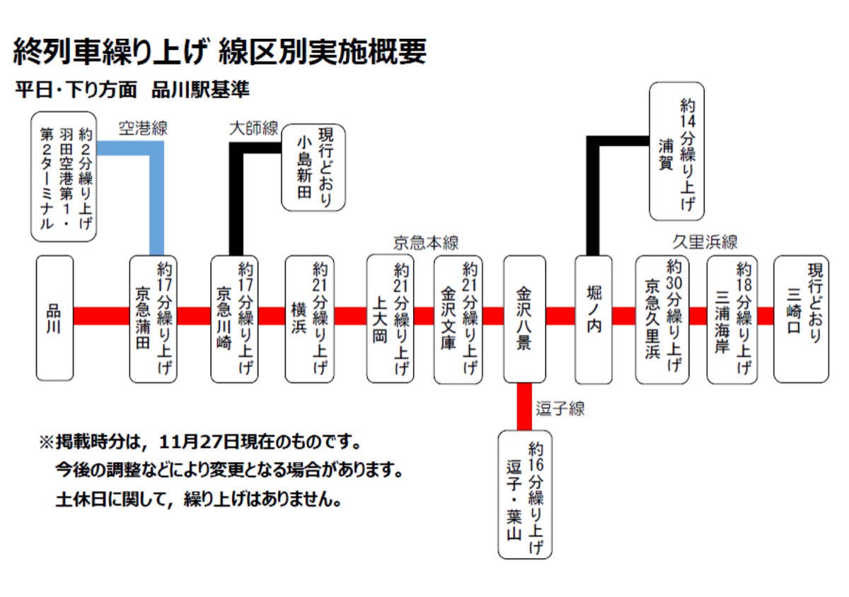 対象は京急線全線(大師線は除く)で、下り方面の終列車を15〜30分繰り上げる(土休日ダイヤ以外)。また、混雑防止のため終列車前に増発をするほか、利用実態を踏まえ運行ダイヤの適正化を検討するとしている。詳細な時刻、上り方面については、2021年1月に発表する予定だ。
