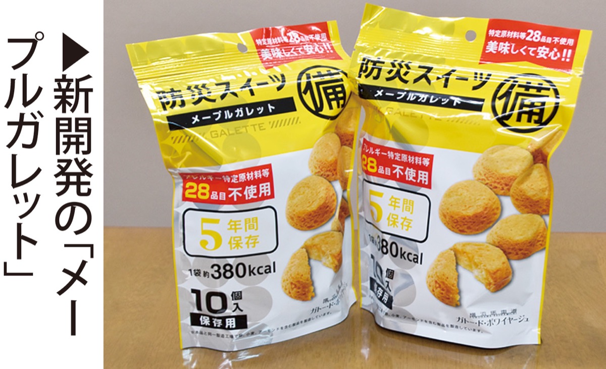 新たに開発されたのは「防災スイーツ メープルガレット」(一袋648円税込)。5年間保存可能な非常食で、アレルゲンに対応した数少ない防災食品だ。
