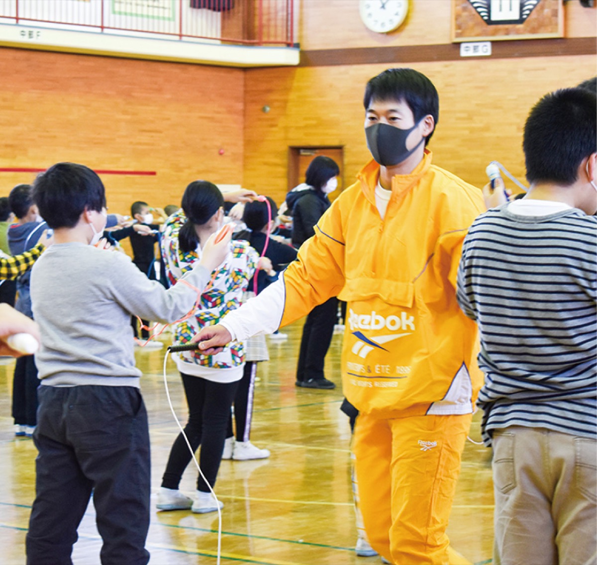 J―TRAPは当時のリーダーが岡村小の卒業生だった縁で、2017年にも来校している。当日はJ―TRAPがダブルダッチなど華麗なパフォーマンスを披露。児童たちは声を出さずに盛大な拍手を贈った。また、なわとび教室では、J―TRAPメンバーが持ち方から、段階を踏んだ練習方法などを丁寧に指導した。メンバーのSHUNさんは「ここ1年はパフォーマンスの場がほぼなかったので、開催できて嬉しい。少しでも笑顔を届けられたらとの思いだったが、逆に子どもの笑顔にすごくパワーをもらえた」と話した。