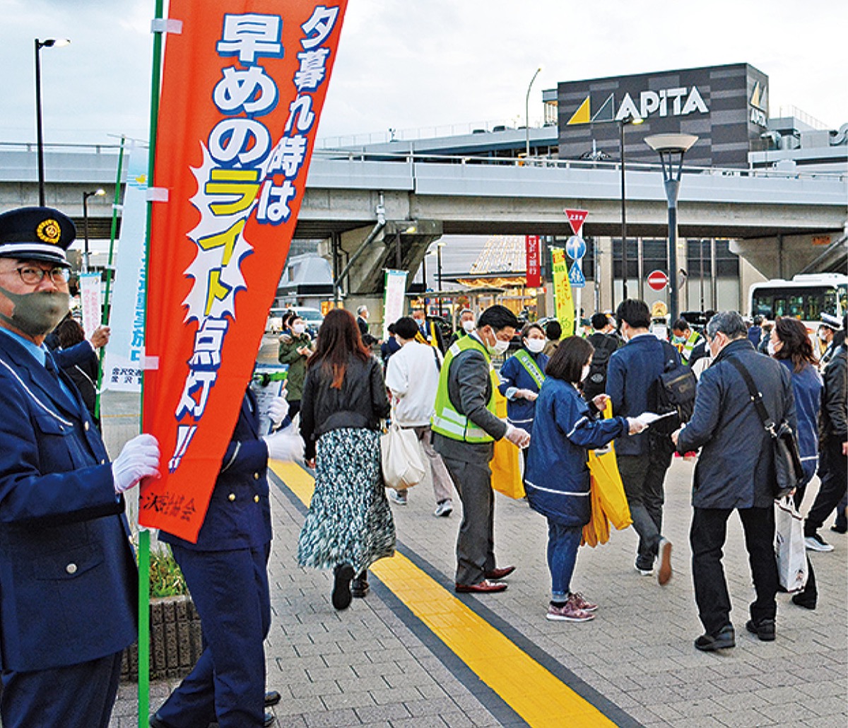 磯子区では8日に洋光台駅前で開催。「交通安全にお気をつけください」と呼びかけながら、反射材などを配布した=同下。磯子交通安全協会の室井烈会長は「悲惨な事故が起きないように力を合わせていきたい」と話した。