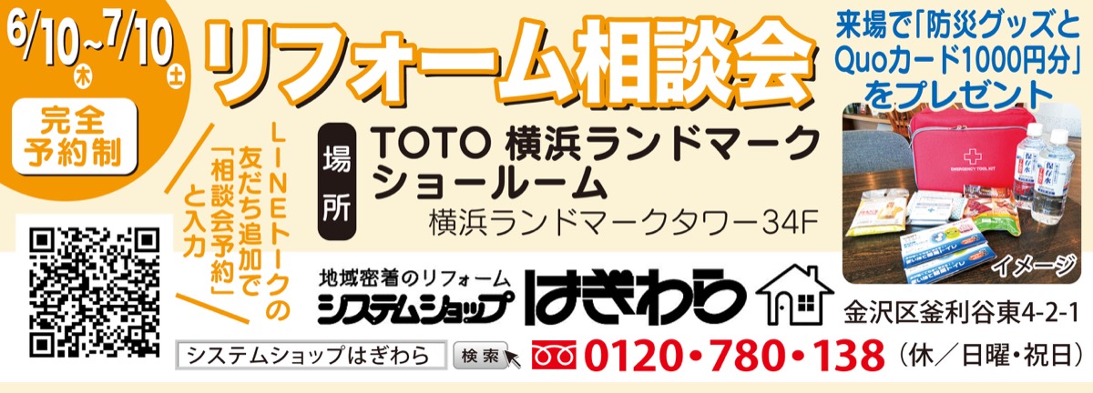 「システムショップはぎわら」(金沢区釜利谷東)は、6月10日(木)〜7月10日(土)、みなとみらいのTOTO横浜ランドマークショールームで完全予約制のリフォーム相談会を開催する。予約は電話かLINEなどで!