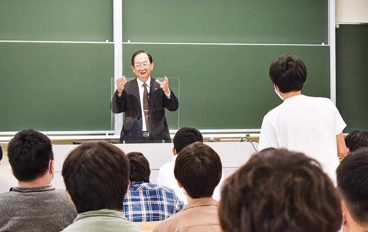 横浜市工業連合会の榎本英雄会長を招いた特別講義が5月26日と6月3日、関東学院大学(金沢区六浦東)で行われた。会社経営者でもある榎本会長は理工学部の1年生に対し、「学生時代にやるべきこと」や「どんな人材が求められているか」「会社を見る観点」などをテーマに話した。