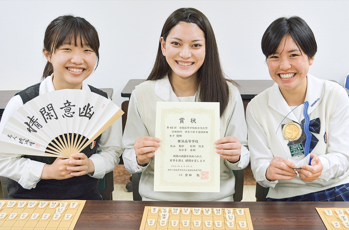横浜高校(金沢区能見台通)の囲碁・将棋部の女子生徒3人がこのほど、全国高校総合文化祭将棋部門の神奈川県予選女子団体の部で優勝。力を合わせて全国大会県代表の座をつかんだ。昨年度から共学となった同校で、女子生徒が全国大会へ出場するのは初めて。