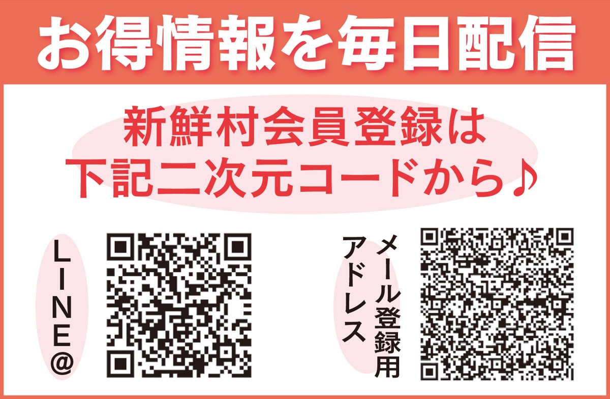 新鮮村は毎月10日、20日、30日に会計が5%引きになるメールやLINEの会員を募集中。毎日、タイムリーなお買い得情報を配信してくれるので、献立作りにも役立つはず。登録は左記二次元コードから。