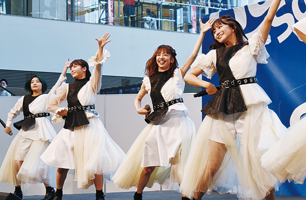 23日は私立恵比寿中学(エビ中)がクイーンズスクエア横浜でライブパフォーマンスを披露。この日は5人のメンバーで「なないろ」など4曲を歌いあげた。曲にあわせ、振り付けを一緒に踊るファンも見られた。