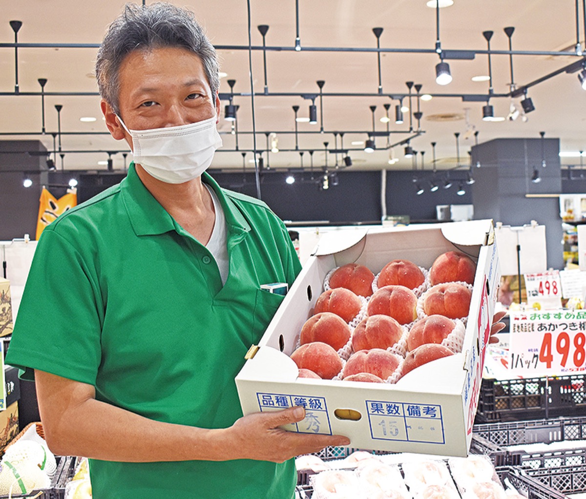 20日(金)はメールやLINEの会員が、レジで会計5%引きになる「メール会員デー」。さらに青果従業員にタウンニュースを持参すると「本場福島県産のおいしい桃」をどれでも1パック半額で提供してくれる。