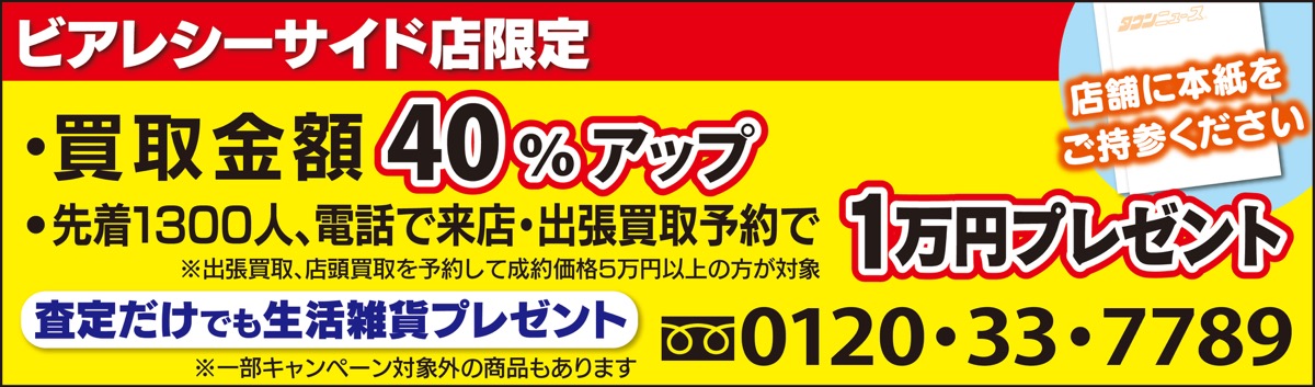 金沢区並木の商業施設「ビアレヨコハマ」本館1階の買取専門店「おたからやビアレシーサイド店」。同店では5万円以上の成約で現金を進呈するなど、先着でお得なキャンペーンを実施中。
