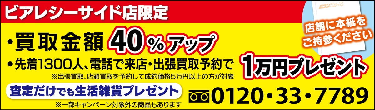 金沢区並木の商業施設「ビアレヨコハマ」本館1階の買取専門店「おたからやビアレシーサイド店」。同店では電話で来店・出張予約をして成約した人に現金を進呈するなど、お得なキャンペーンを実施している。