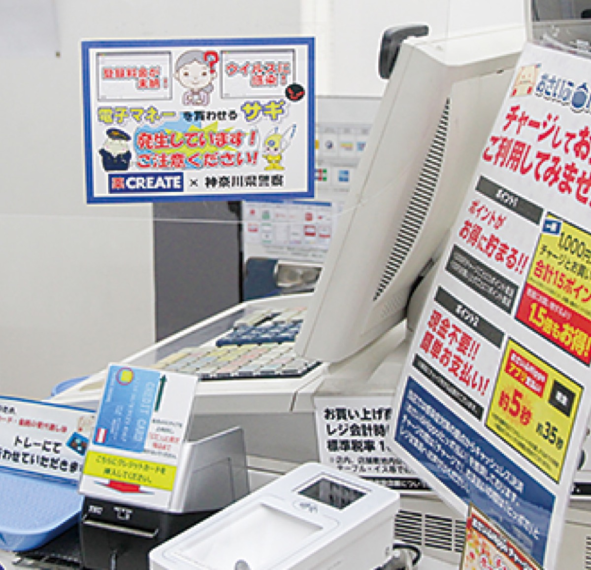 これは県警本部が(株)クリエイト エス・ディーに協力を要請し、県内約380店舗で実現したもの。ステッカーは同社が作成したA6サイズ(縦10・5cm×横14・8cm)で、レジ前の飛沫防止シートに貼られている。「登録料金が未納」「ウイルスに感染」などと騙り、電子マネーを買わせる詐欺が発生していることを伝えながら注意を促す内容だ。また、一部店舗ではレシートでも詐欺への注意を記載している。