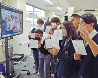 最後に「他者の幸せのために私たちができること」を双方の生徒学生の一人一人が紙に書き、画面の前で見せ合った。