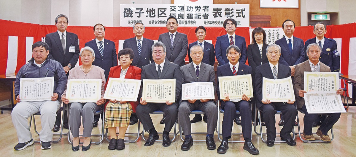 ▽神奈川県警察本部長・地域交通安全活動推進協議会連絡協議会会長連名表彰 交通安全功労者=林昌邦▽関東管区警察局長・関東交通安全協会連合会会長連名表彰 優良運転者=橋本紳二、柏延明▽県警察本部長・県交通安全協会会長連名表彰(銅賞) 優良運転者=金子博和、藤岡清二▽県交通安全協会会長表彰 交通安全功労者=並木寛、依田広子、内山初江/優良運転者(20年)=平野正倫/同(15年)=岩室一成、本庄広子▽磯子警察署長表彰 交通安全功労=(株)大倉、洋光台地区交通安全母と父の会/優良安全運転管理者=大橋岳彦((株)大橋商店)▽磯子警察署長・磯子安全運転管理者会会長連名表彰 優良安全功労=横浜南糧商事(株)▽磯子交通安全協会会長表彰 交通安全功労=学校法人育美学園育美幼稚園、クリキ工業(有)、岩倉信之▽磯子安全運転管理者会会長表彰 優良安全運転管理事業所=(株)サンビームランドリー、(株)八堂