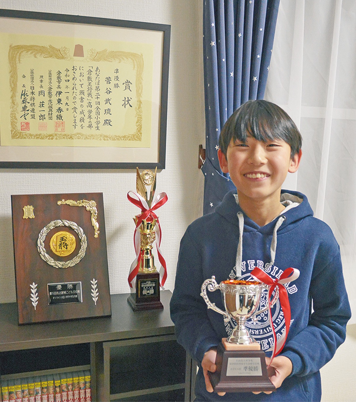 磯子区の山王台小学校4年の菅谷武琉君(10)が、1月9日に岡山県倉敷市で開かれた「第20回全国小学生倉敷王将戦」の高学年の部で準優勝した。神奈川県予選を制した実力を発揮し、上級生が多い中で決勝戦まで勝ち進んだ。
