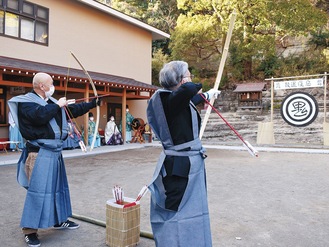 金沢区瀬戸の瀬戸神社で2月3日、節分祭追儺御歩射式が行われた。例年、節分は豆まきが行われるが、今年は昨年に続き中止に。代わりに弓矢による祓いで災厄消除や悪疫退散を祈念した。