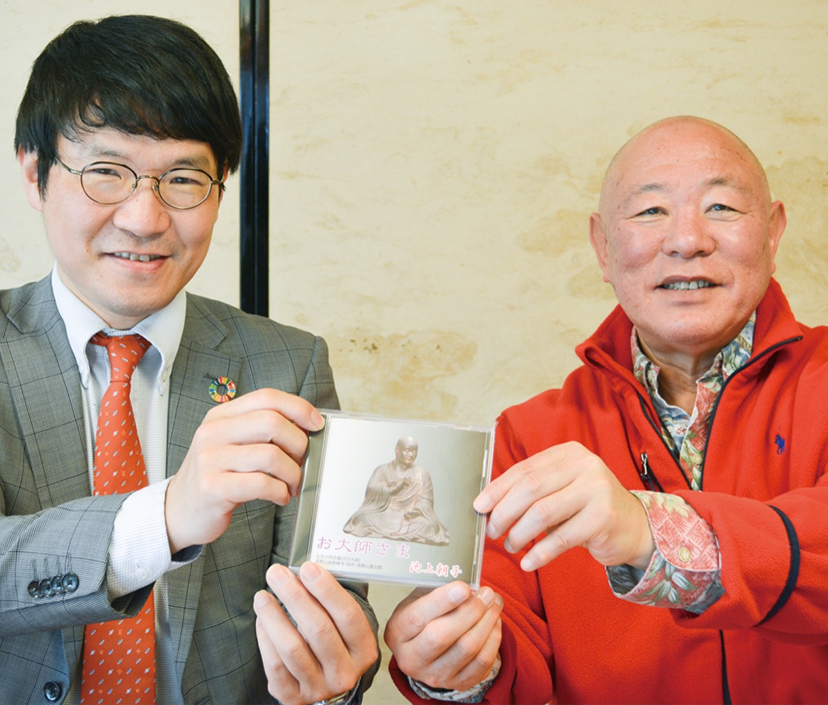 楽曲制作にあたり、小竹さんは区内磯子にある真照寺の水谷栄寛住職に協力を依頼。盆踊りのような曲調の軽やかなメロディーに池上さんが歌をのせ、「南無大師遍照金剛」という宝号を水谷住職を含めて同寺の3人の僧侶が唱えた。「親しんでもらいやすいように軽やかに作った。皆さんの協力で良い楽曲に仕上がったと思う」と小竹さん。水谷住職は「お大師様やお寺に興味を持ってもらうきっかけになれば」と話す。