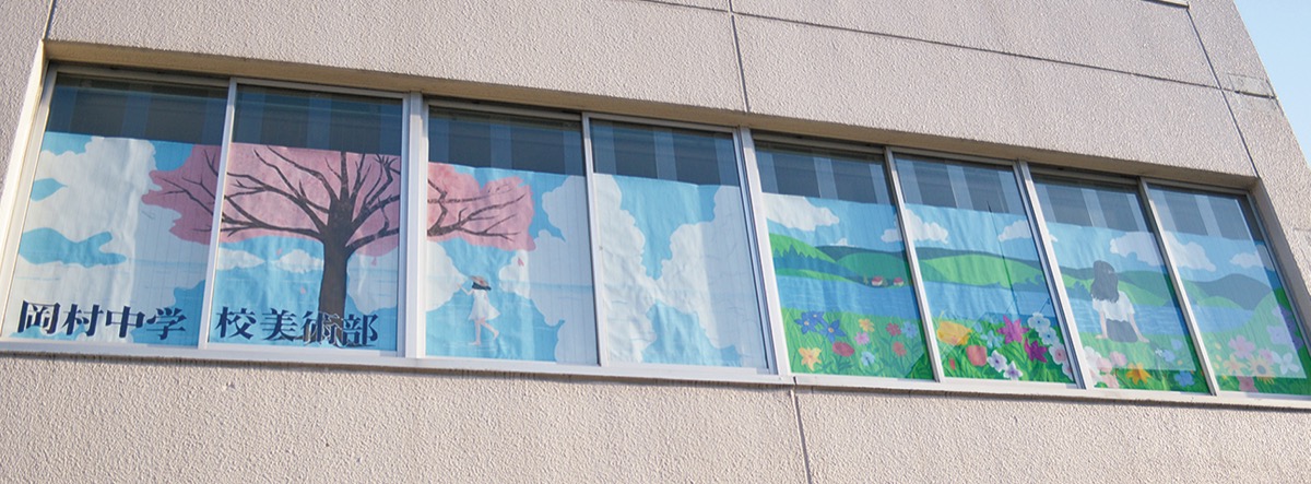 コロナ禍でまちが暗く感じられたという同社の奥村佳正代表取締役。学生にとっても発表や展示の機会が減っていると聞き、近隣の岡村中に依頼して実現した。作品は美術部の3年生12人が8枚の窓に合わせて制作。体育祭や文化祭の看板制作と並行し、計18時間で完成させた。原画を考えた崔(さい)慧(けい)玲(れい)さんによると「春と夏」をテーマにデザインし、咲き誇る桜や緑の木々とたくさんの花々を描き、女の子の髪や帽子で風がそよいでいる様子を表現したという。