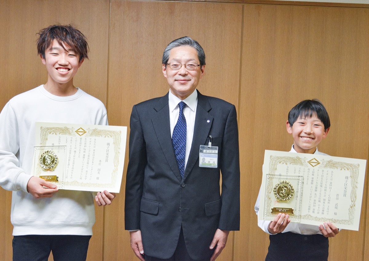 2人は2日に磯子区役所を訪れ、猪俣宏幸区長から賞状と記念盾を受け取った。猪俣区長は「磯子区の名誉を上げていただく素晴らしい功績。上を目指すのは大変だと思うが、今後の活躍も楽しみにしている」と称え、2人のさらなる活躍に期待を寄せた。