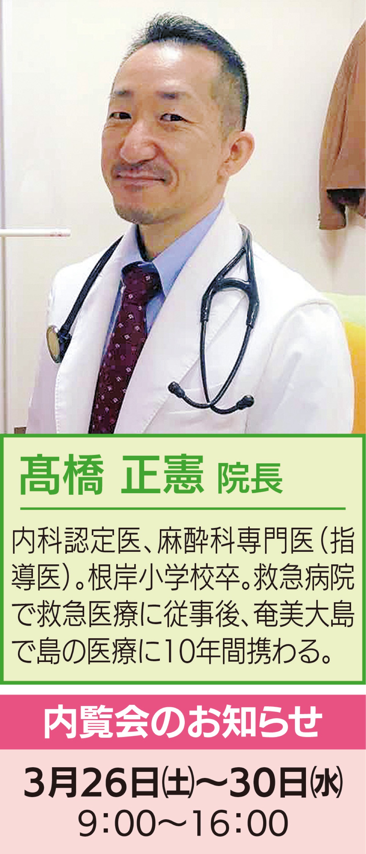 「根岸」駅より徒歩9分の閑静な住宅街に4月1日(金)、「下町診療所」が開院する。同院の高橋正憲院長は、救急病院で救急医療に従事後、奄美大島に渡り”島の医療”に10年間携わってきた。「救急医療や島の医療現場では、多くの患者を救うため、多岐にわたる総合的な診療が必要でした」と話す。その経験から内科、外科、整形外科、麻酔科など診療科目を幅広く設定。受診後、笑顔で帰宅できるように診療科にとらわれず、身体も心も痛みの無い生活が送れることを大切にしている。コンセプトは「親身で親切、断らない医療」。誰でも気兼ねなく受診できる敷居の低い診療所を目指す。また、受付から診察、会計までの時間を極力時短するなど、患者の負担軽減になる取組みも多い。感染症対策も万全で入り口から会計まで全て別室と徹底している。訪問診療は往診から看取りまで行う。まずは気軽に相談を。