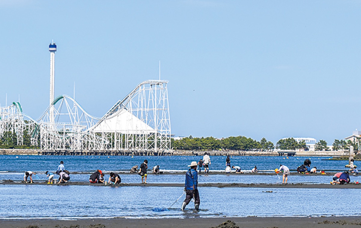 同公園で採れるのは、アサリやマテガイなど。今年もアサリの数は少なめの様子。無料で楽しむことができるが、一度に採る量は2kg以内に制限されている。また2cm以下の稚貝を採ることや、幅15cmを超える貝採り器具の使用は禁止されている。潮干狩りに適しているのは、潮の満ち引きが大きい大潮の日で、最大干潮時刻の前後2時間くらいがねらい目だ。