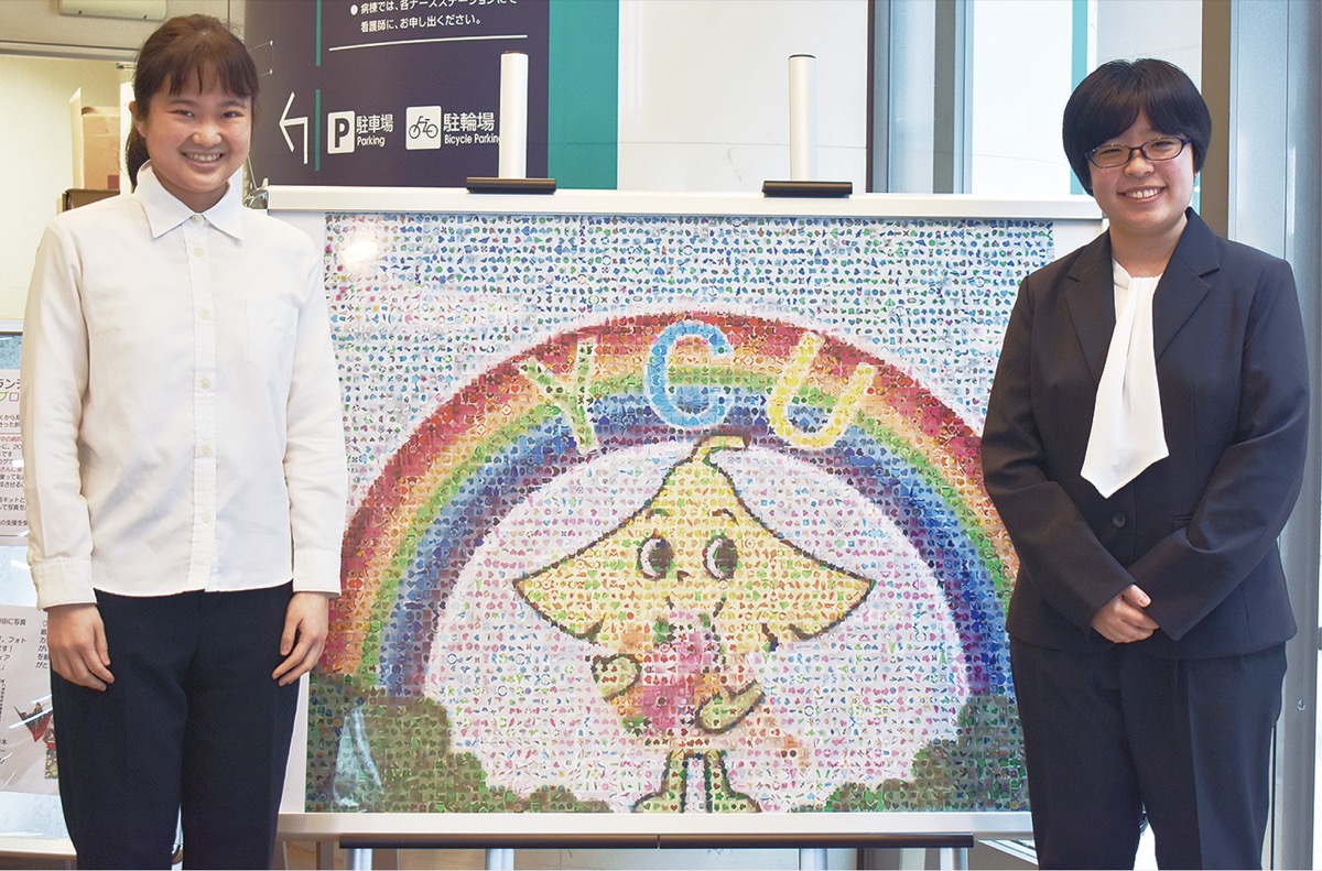 センター病院の患者に配るため、案内書、折り方説明書、アンケート、折り紙6枚をセットにしたキットを700セット以上用意。「ご自由にお取りください」と書いた配布箱を院内に13ある病棟デイルームと金沢八景キャンパスの2カ所に設置した。4カ月半で集まった折り紙は約2000個。会計を担当した淺香柚月さん(国際マネジメント研究科修士1年)は「社会科学の面から医療に貢献したいと思っていたので、嬉しかった」と話す。集まった折り紙は一つひとつ写真に撮り、同大学のキャラクター「ヨッチー」を描いたフォトモザイクアートを完成させた。