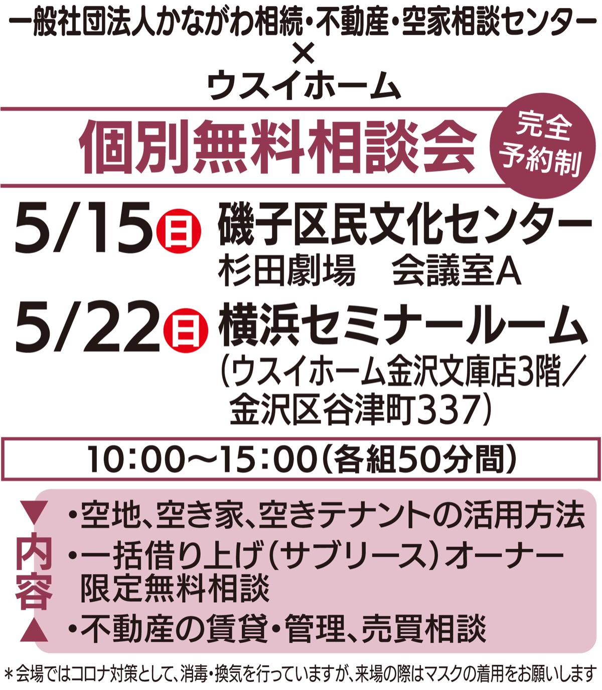 5月15日(日)に杉田劇場、22日(日)に横浜セミナールーム(京急金沢文庫駅前)で開催される相談会は、横浜・横須賀・湘南を中心に県内で不動産事業を展開する(株)ウスイホームとの共催。「祖父の代から継いだ自社ビルを今後どうすればいいか」「サブリースなどで所有物件の収益性が低下している」「入居者のいるアパートを売却したい」「手持ちの物件を早く現金化したい」といった不動産に関連する個別相談を実施する。