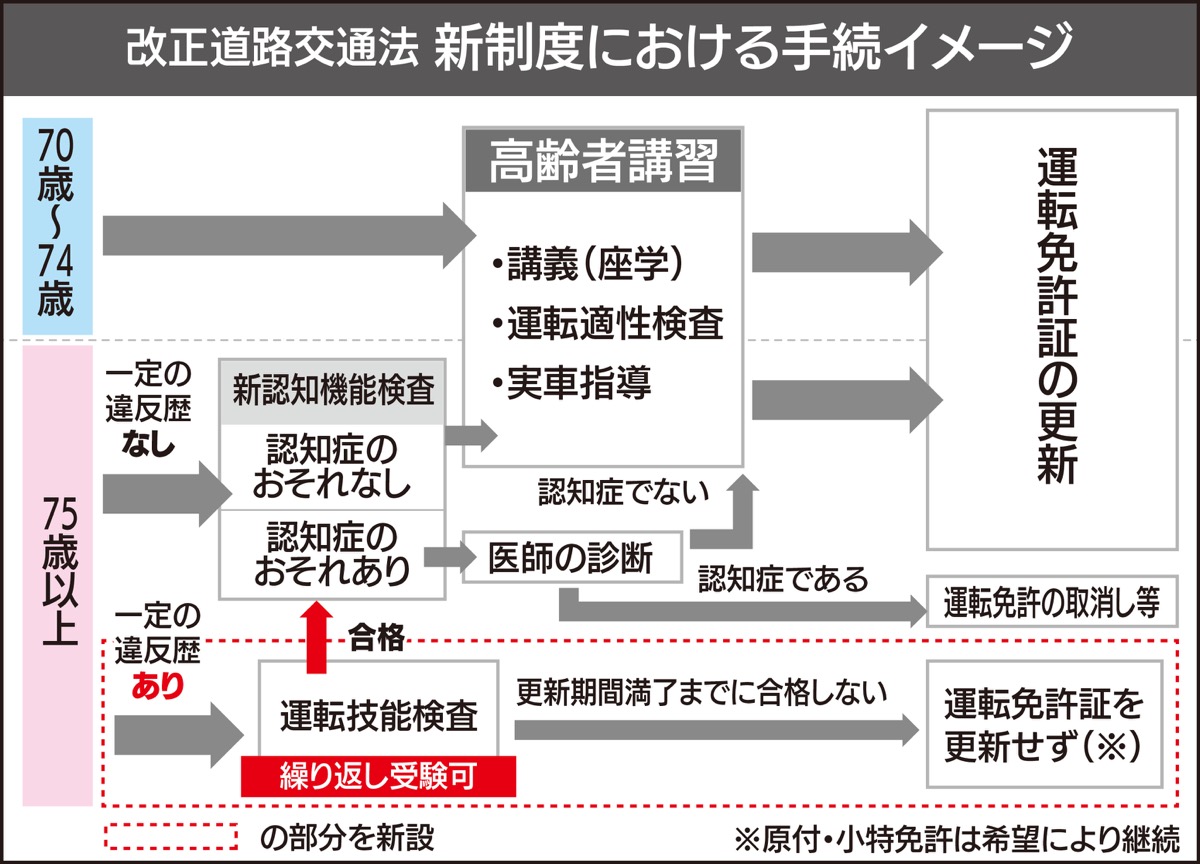 5月13日から施行される道路交通法(図参照)では75歳以上で一定の違反歴のある運転者は、免許センターで警察職員による運転技能検査が義務化される。段差に乗り上げた際に素早く反応してブレーキを踏めるかなど、高齢者に多い事故を想定した検査を実施。この改正に伴い、高齢者講習の実車指導内容も変更される。