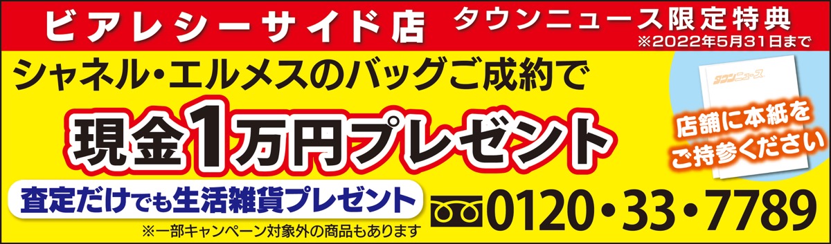 金沢区並木の商業施設「ビアレヨコハマ」本館1階にある買取専門店「おたからやビアレシーサイド店」は現在、シャネルとエルメスのブランドバッグの買取を強化中。成約で現金を進呈しており、スタッフは「古くても壊れていてもOKです。この機会にぜひご相談ください」と話す。