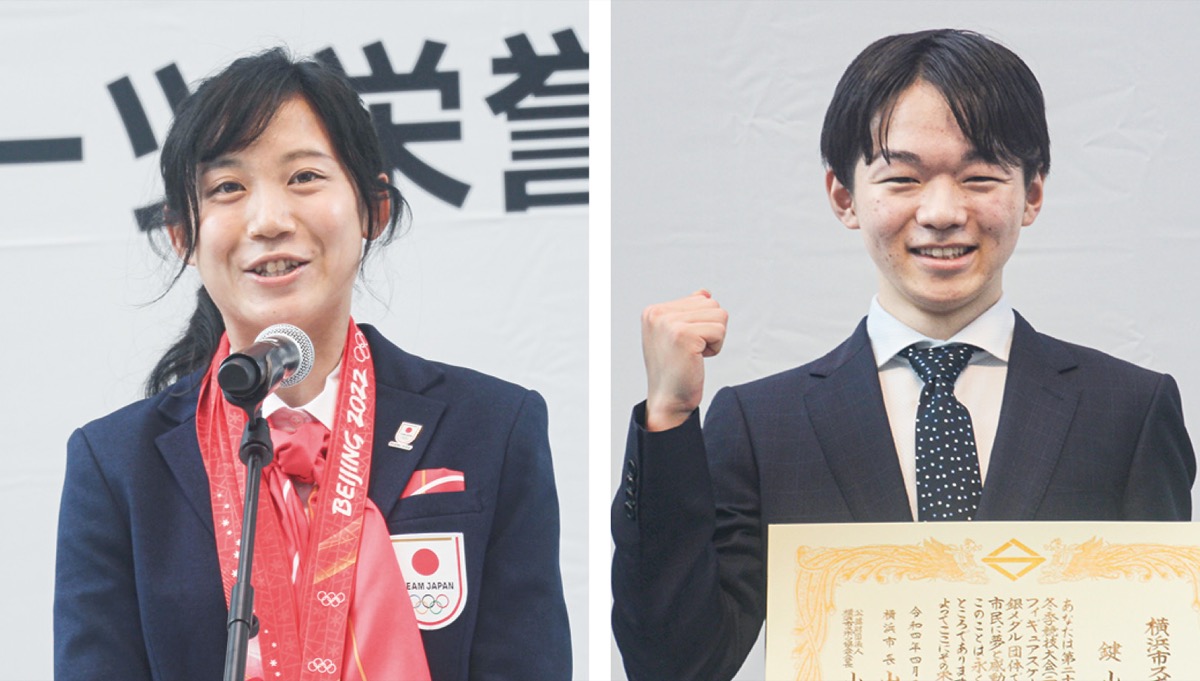 個人、団体と2つのメダルを獲得した鍵山選手は、六角橋中学校出身で横浜銀行アイスアリーナ(神奈川区)を練習拠点としていた。現在は愛知県に拠点を移している。贈呈式には山中竹春市長や(公財)横浜市スポーツ協会の山口宏会長、横浜市会高橋正治副議長が出席し、賞状や記念品を手渡した。鍵山選手は「横浜で過ごした中学、高校の6年間で選手として、人として成長できた。4年後はもっと良い色のメダルをとりたい」と話した。
