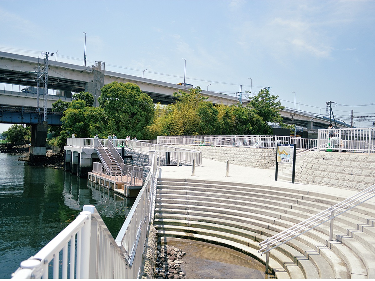 完成した施設には親水護岸を整備。満潮時に川の水が溜まる作りのため、川の水に触れたり、魚などの生き物も間近で観察できる。また、同川の歴史や土木遺産に選定された資産価値を伝える看板、船舶やカヌーなどが横付けできる浮さん橋も設置。SUPやカヌーなどを使ったレクリエーションでの活動により、まちのにぎわい創出なども期待される。同川を管轄する横浜川崎治水事務所の千葉淳所長は「多くの皆さんが『かわ(河・川)』にふれ、良さを感じていただければ。地域で長く愛される施設となることを期待している」と話す。