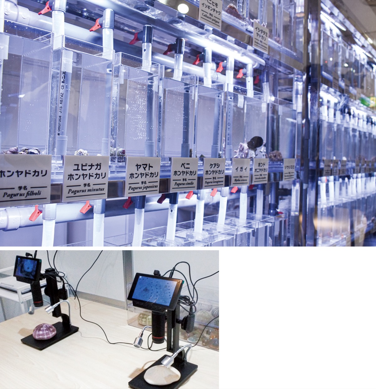 研究室のような展示スペースは、6つのラボから構成。同実験所と同じ仕様の水槽がずらりと並ぶ「身近な海の多様性ラボ」では、ヤドカリやイソギンチャクなど100種類を超える小型生物を展示する。そのほか、貴重な生物データの公開や繁殖についての研究紹介をしているラボや、ミクロ生物を電子顕微鏡で観察できるエリアがある。