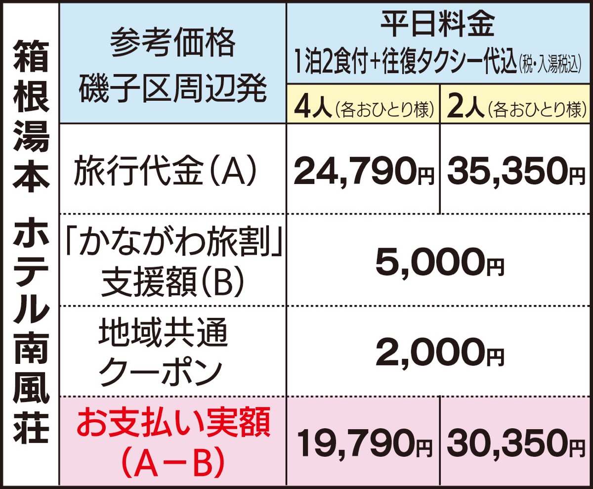 このプランは自宅から宿泊先までの往復をタクシーで移動する宿泊付ツアー。宿泊先は箱根や熱海など7つのホテルから選べ、地域共通クーポンも付与されてお得に旅が楽しめる。感染症対策をした車で、自宅からホテルまで直接移動できるため、高齢者や車いすでの利用も多い。詳細や申込はエヌケイキャブ【電話】045・752・1321。