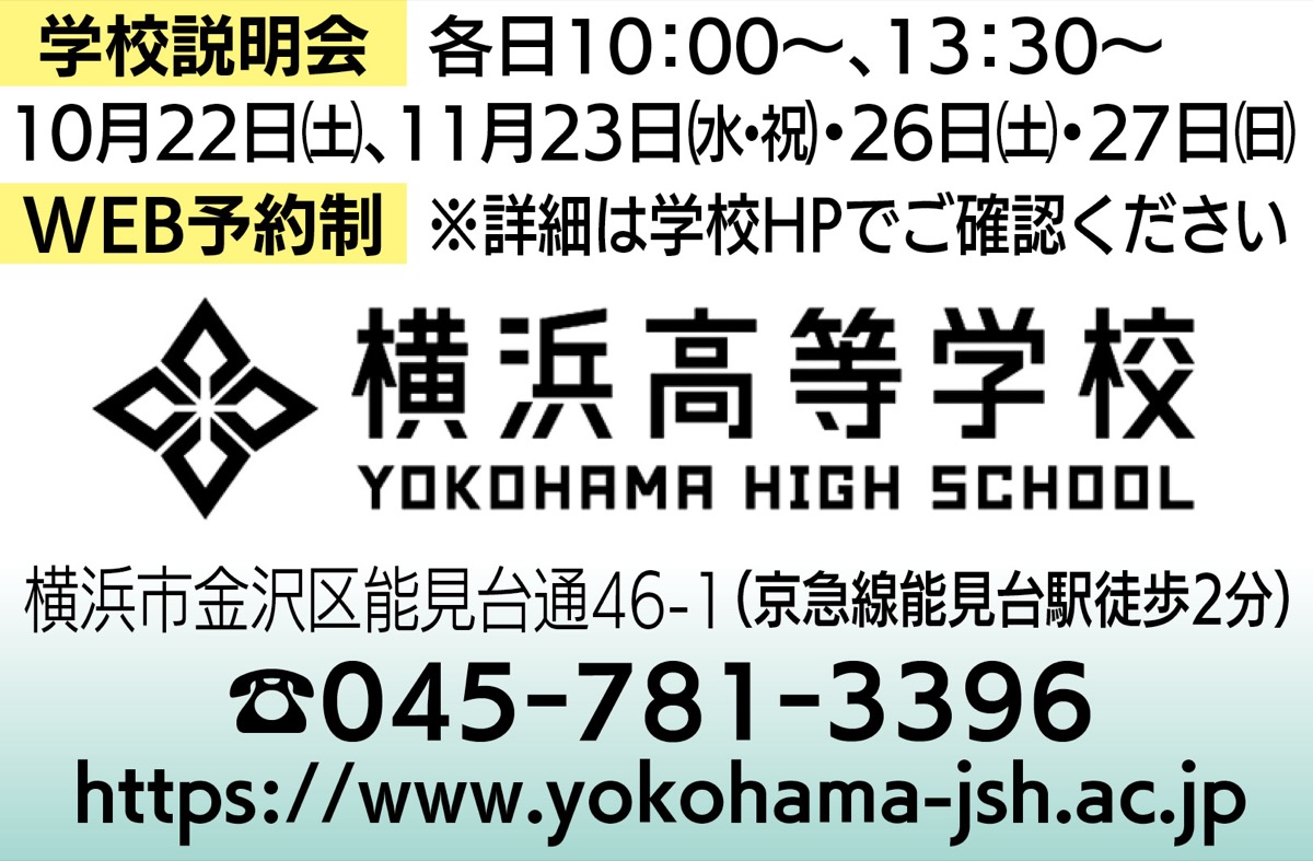 学校説明会を左記日程で行うほか、10月10日(月・祝)に横浜学園、横浜清風など市内の私立高校7校が横浜高に集まって合同入試相談会を開く。午前10時から午後3時30分(最終受付3時)。予約不要、入退場自由。「学食の利用もできますので、気軽にお越しください。活気ある明るい雰囲気をぜひ感じてください」と館山教頭。