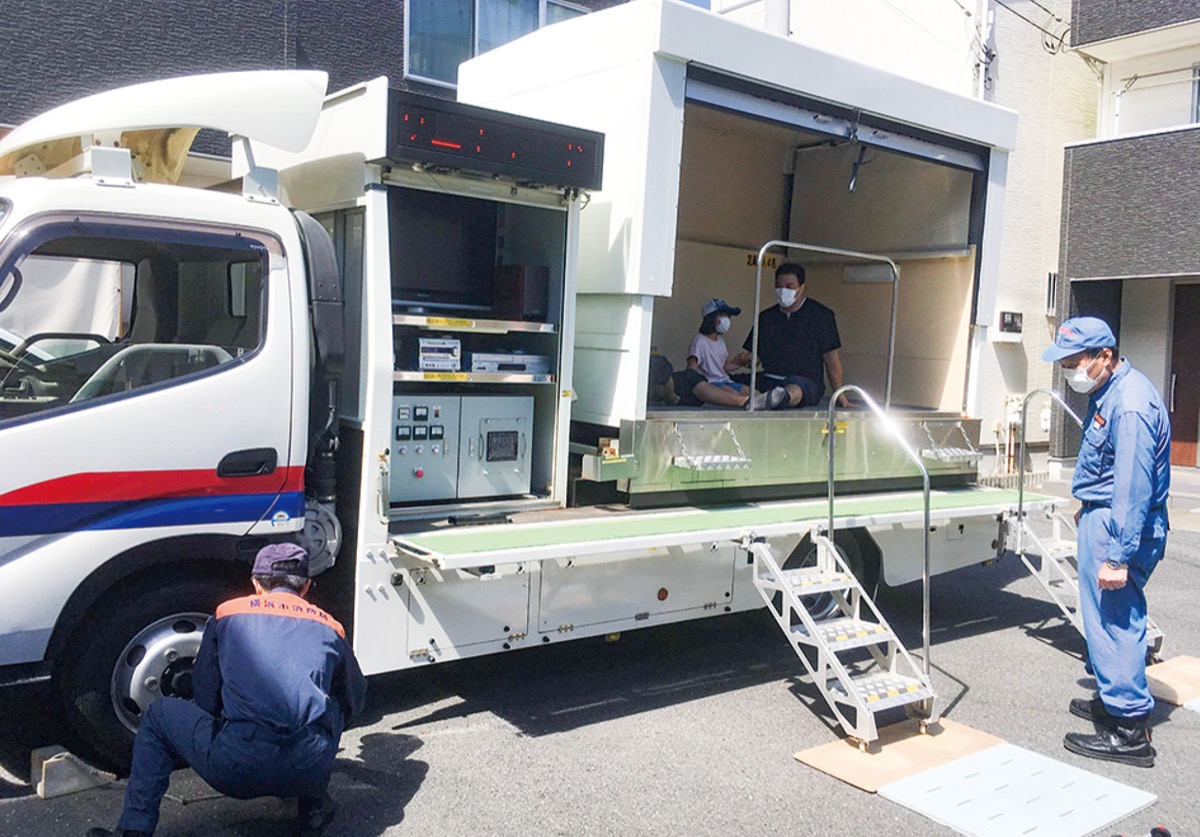初開催となった9月11日の訓練は、同校から少し離れた大道2丁目の旧青木製作所跡地住宅で行った。金沢消防署六浦消防出張所や金沢消防団の協力を得て、住宅に囲まれる中で参加者は消火器による初期消火体験やAEDを使った心肺蘇生法を実践。さらに、起震車による震度7の揺れ体験や、子どもが楽しめる消防車との撮影会、防災グッズの配布も行った。長島副会長は「もう少し参加者が増えてほしかったが、子どもも多く来てくれたのはよかった」と話す。