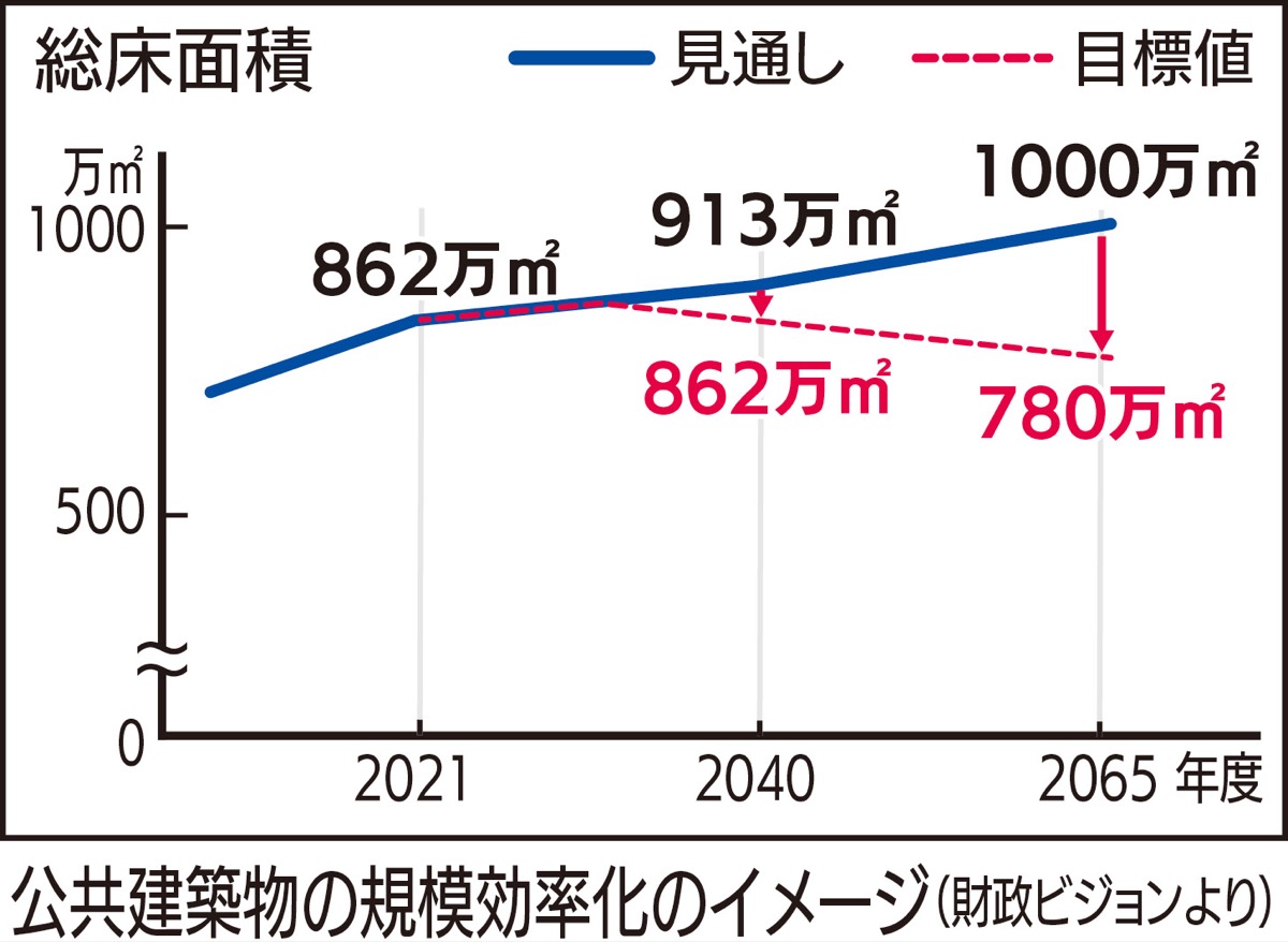 徐々に適正化を進め、市内施設の総床面積を21年度と比べて40年度時点で増やさず、65年度時点での1割縮減を目標とする。「整備中の話を止める訳ではない。サービスを維持するため、適切に配置していく」と市担当者。10月26日まで素案への意見を募集し、年内に計画を固める予定だ。