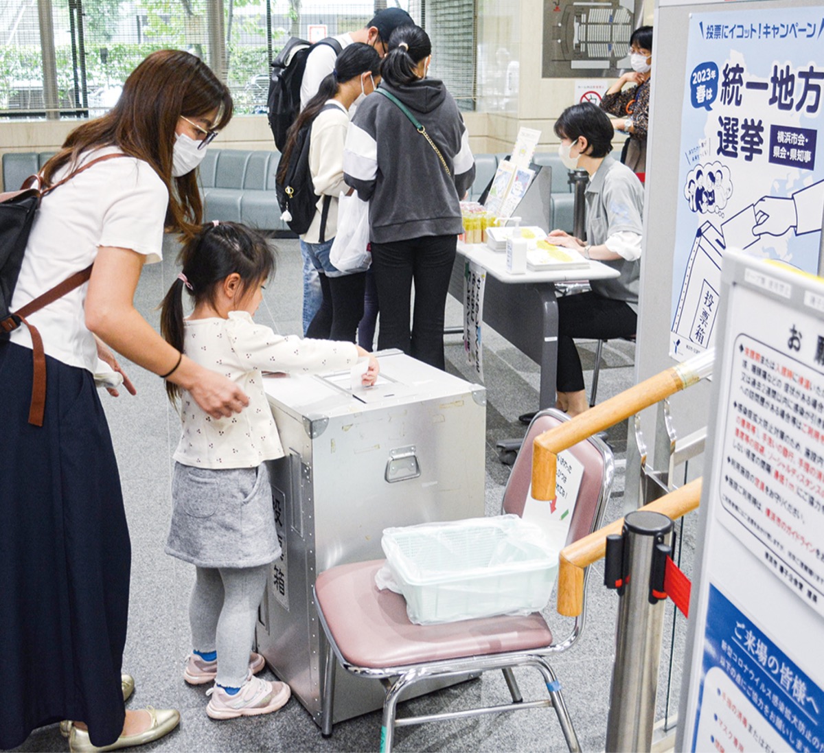 金沢区でも、同日に開かれた「いきいきフェスタ」の会場で、金沢区明るい選挙推進協議会が模擬投票を実施。このほか各区は日頃から学校への選挙器材の貸出や、小学校での出前授業などに取り組む。実施状況や内容は各区で異なるが、磯子区では毎年貸出が8校程度、出前授業は1校以上、金沢区も約10校への貸出、約3校への出前授業を行っている。