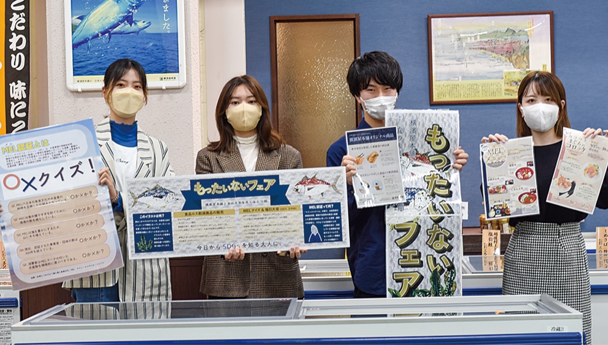 今年度はマーケティング論やブランド・マネジメントなどを学ぶ柴田ゼミ3年生の赤嶺舞彩花さん、星本彩朱さん、深澤さくらさん、田中佑季さんの4人がメンバーに。水産資源の持続性と環境に配慮している事業者を第三者が審査し認証した印であるMELマークの認知の低さと食物ロスという、2つの"もったいない"の解決を目指してきた。5月からほぼ週1回のペースで打ち合わせを重ね、市場調査やポスター製作、店舗デザインなどを行った。