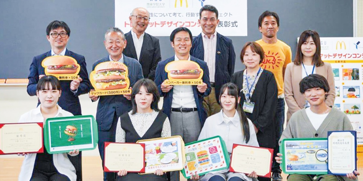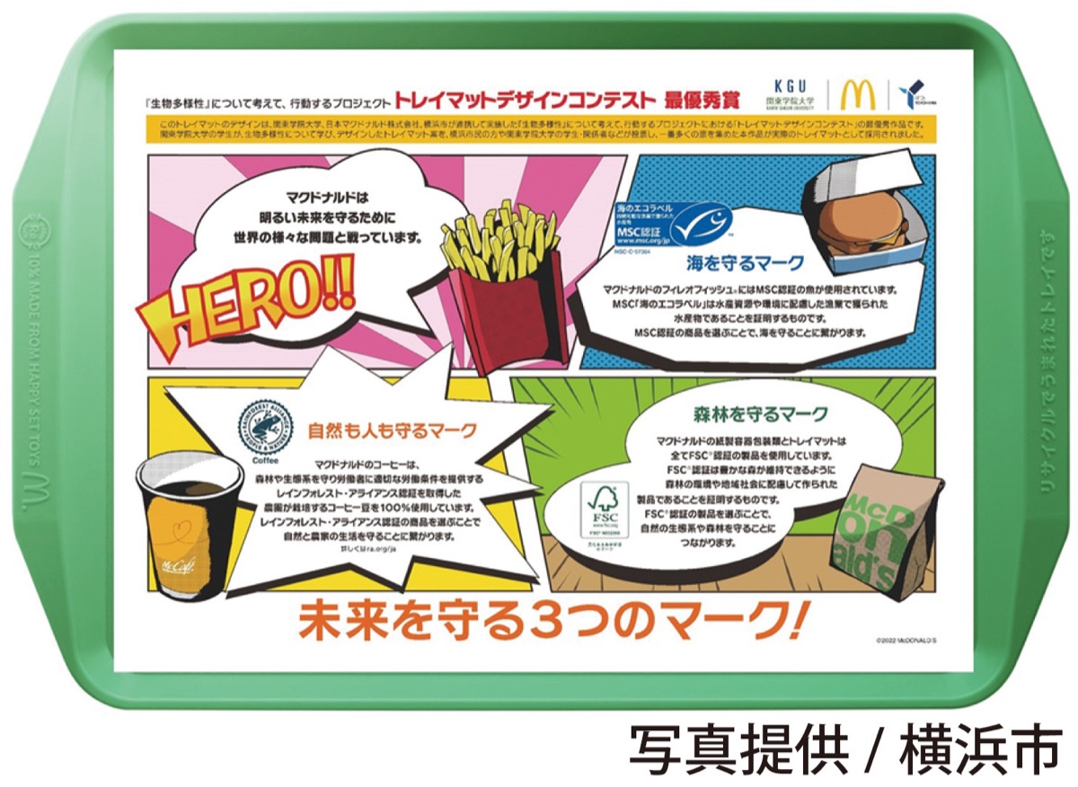 関東学院大学(金沢区六浦東)と日本マクドナルド株式会社、横浜市は、「生物多様性」について考え行動するプロジェクト「トレイマットデザインコンテスト」を連携して実施。オンライン投票で最優秀賞に選ばれた学生考案のトレイマットが10月26日から1週間、市内のマクドナルド全店舗で使われた。また11月9日からも1週間、同様に展開される。