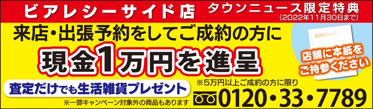 買取専門店「おたからやビアレシーサイド店」では、11月末まで来店・出張予約をした人向けのキャンペーンを実施中。予約後の買取成約で買取金額と別に現金1万円を進呈しており、スタッフは「どんな品物でも査定しています。ぜひこの機会に、ご予約してご相談ください」と話す。
