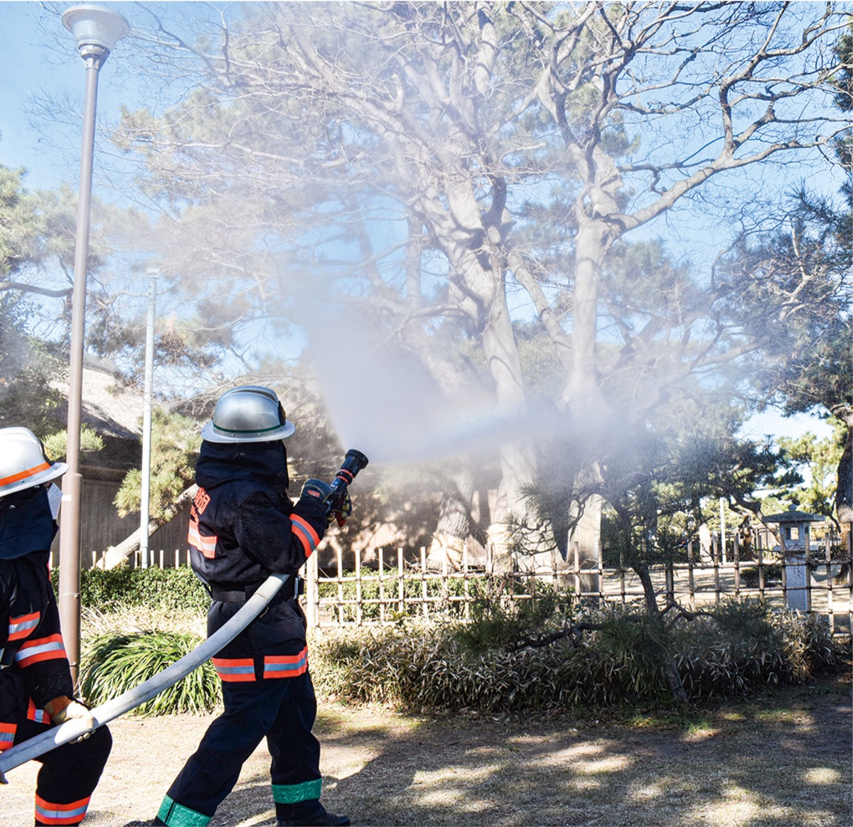 28日には金沢区の旧伊藤博文金沢別邸(野島町、横浜市指定有形文化財)で実施。金沢消防署員と消防団員、施設職員、合わせて48人が参加した。邸内から火災が発生した想定で、来館者の避難誘導や初期消火の動きを確認。最後は同別邸では2016年以来となる一斉放水が行われた。