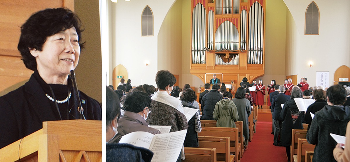 礼拝、讃美歌の斉唱、パイプオルガンの演奏が行われた後、最後のあいさつとして山口会長が登壇。創設50年の歴史を残そうと冊子を作成した経緯に触れ、「短大の存在を残したかった」とし、「学校がない中でも、多くの協力のおかげで会の活動を続けられたことに感謝している」と大学関係者、参加した同窓生に対し謝意を示した。