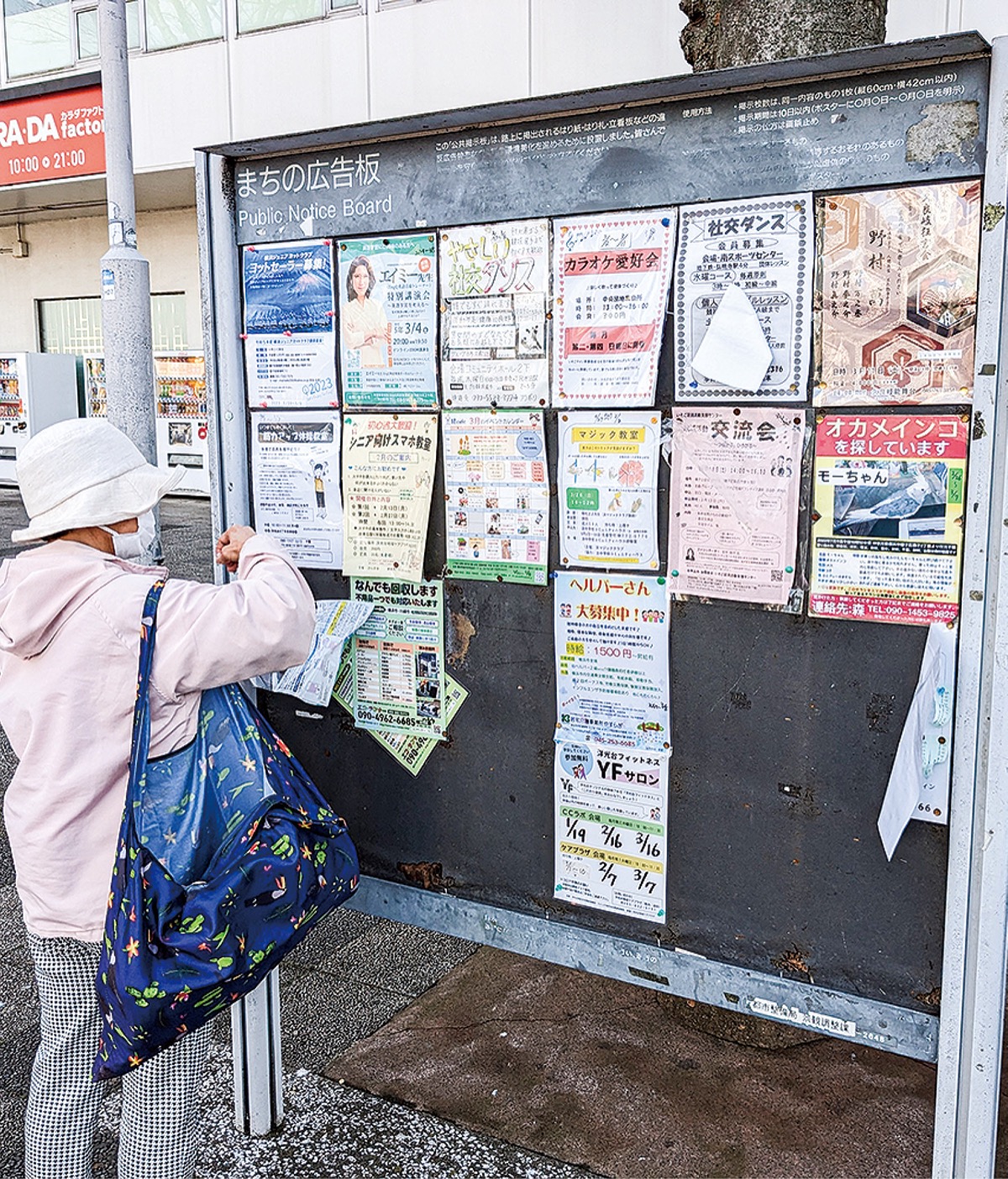 公共掲示板は「まちの広告板」の名前で、市内の駅の近くやスーパーのそばに設置。掲示できるのは縦60cm×横42cm以内のもので、1回につき10日以内などの利用規約がある。自治会町内会が管理している掲示板とは異なり、利用者がその場で掲示することができる。