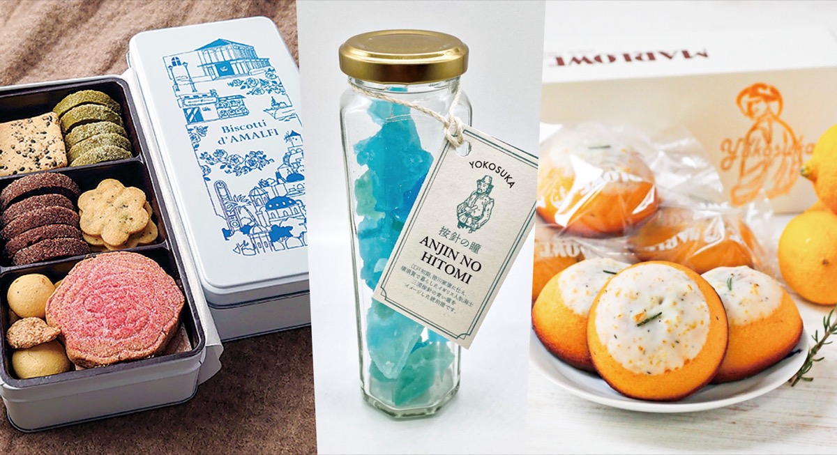 同市観光協会主催の「横須賀おみやげアイデアコンテスト」受賞商品の中からビーカープリンで知られるマーロウの「横須賀産ハニーレモン 潮風ボーロ」やアマルフィイの「クッキー缶」、ひれカツやなせ支店の「家で揚げない『ひれカツFROZEN PACK』」などが一堂に揃う=写真は一例。時間は午前10時から午後8時(17日のみ午後9時)。