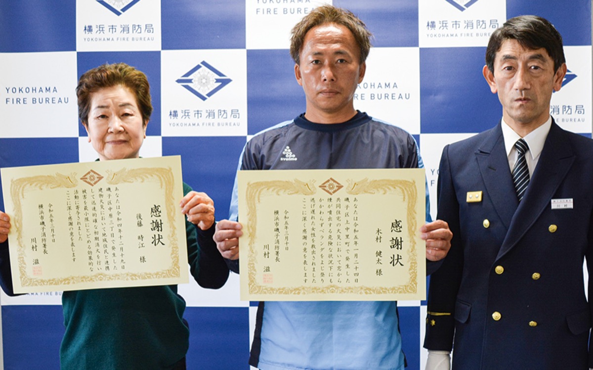 磯子消防署(川村滋署長)は3月10日、区内の火災現場で初期消火を行った後藤時江さん(78)と、救助活動を行った木村健太さん(44)に感謝状を贈呈した。
