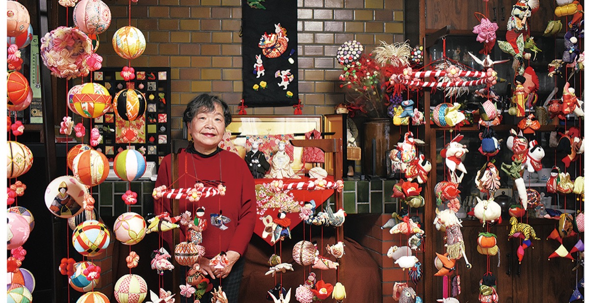 三大つるし雛の一つ、伊豆稲取のつるし雛を20年以上前から作ってきた佐々木さん。7本の糸それぞれにある7つのつるし飾りには、一つ一つに意味があるという。「例えば、桃は邪気を払う、巾着はお金に困らないようにと、それぞれに願いが込められているんです」と話す。展示にあたり、色のあせたつるし飾りは作り直し、色鮮やかに仕上げている。