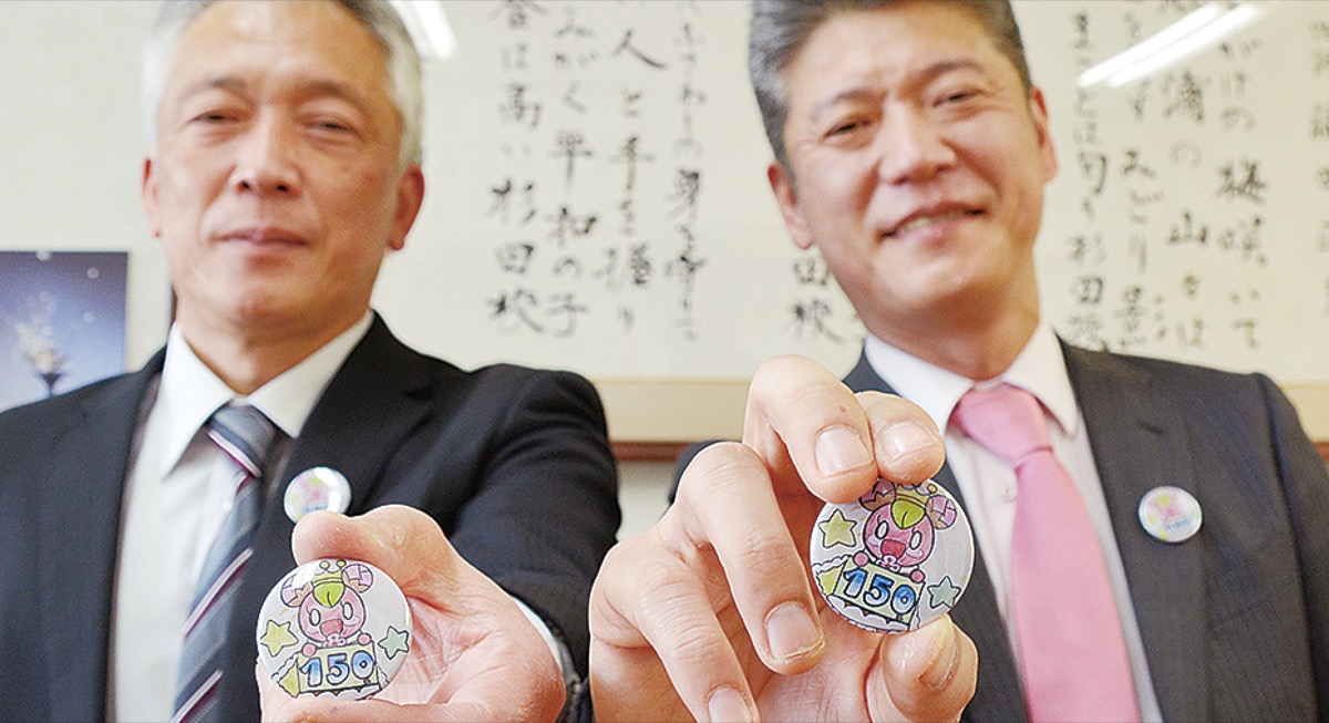 「卒業生たちも150周年という一大イベントにより深く関わってほしい」という安藤代表の思いから、卒業式の前日に安藤代表が同校を訪れて藤崎健児校長へバッジを手渡した。バッジは翌日に卒業した6年生107人に配布されたほか、他学年の児童や新入生にも配る予定だという。