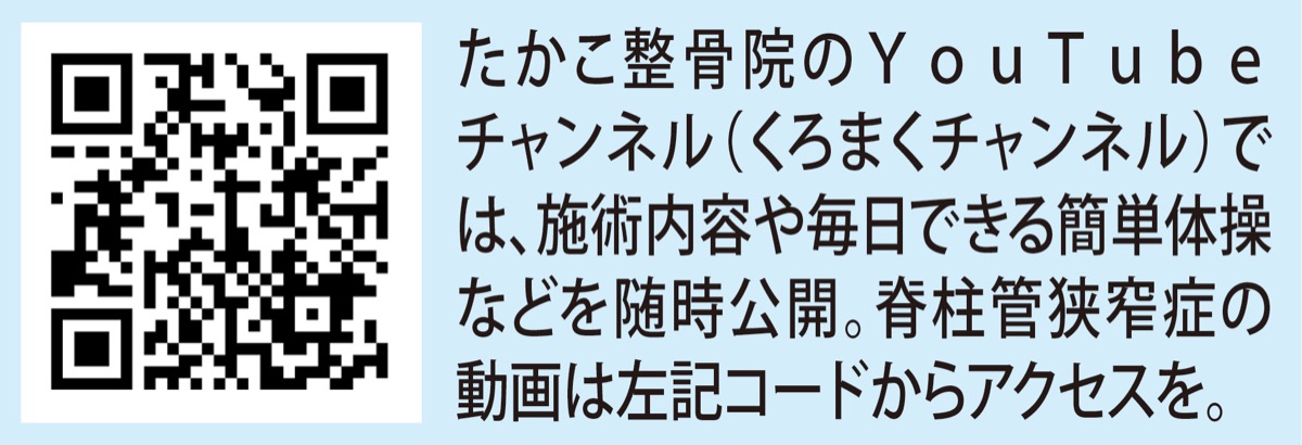 金沢区柳町にある「たかこ整骨院」の高子大樹院長は、数々の患者を診てきた経験から「背骨のねじれ」に着目。手技などでねじれを緩和させ、痛みやしびれの軽減を目指す。その施術に信頼を寄せ、足繁く通う患者も。「もちろん症状を戻さないために日々の体操も必要です。きちんと実践している人がよくなっている印象」と話す。高子院長のYouTubeチャンネルでは、簡単な体操や施術内容などを説明しているので参考に。