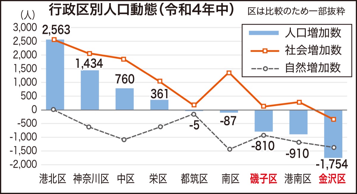 区別にみると、金沢区は社会増減が375人、自然増減が1379人とともに減少し、市内で最も減少幅が大きかった。社会動態で減少した区は市内で2区ののみ。金沢区の人口は07年の21万2423人をピークに減少し続けている。磯子区は社会増減が130人増、自然増減が940人減だった。