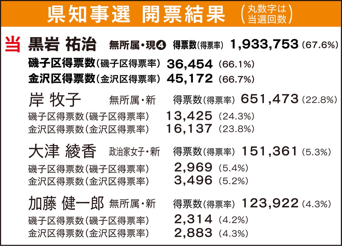 無効票が約21万票あり、前回の約2・4倍。投票総数に対して6・91%で、黒岩氏が初当選した2011年以降では最も高い割合だった。投票率は40・35%で過去最低だった前回を0・07ポイント上回った。