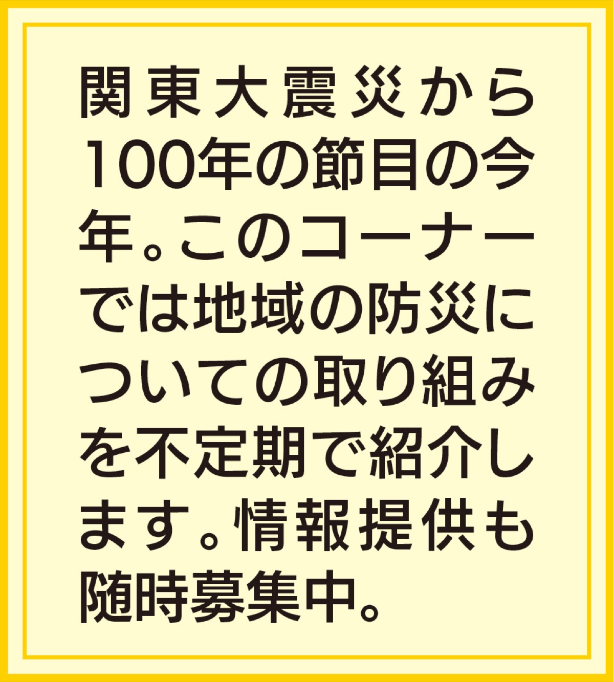 金沢区の六浦ハイタウン町内会は毎月11日、黄色いたすきを使った安否確認訓練を行っている。家の扉や門などにたすきを結び付けて無事を示し、付いていない家庭は訪問して状況を確認。同町内会の「安心・安全な町づくりを考える会」が企画し、約6年にわたり続けられている。