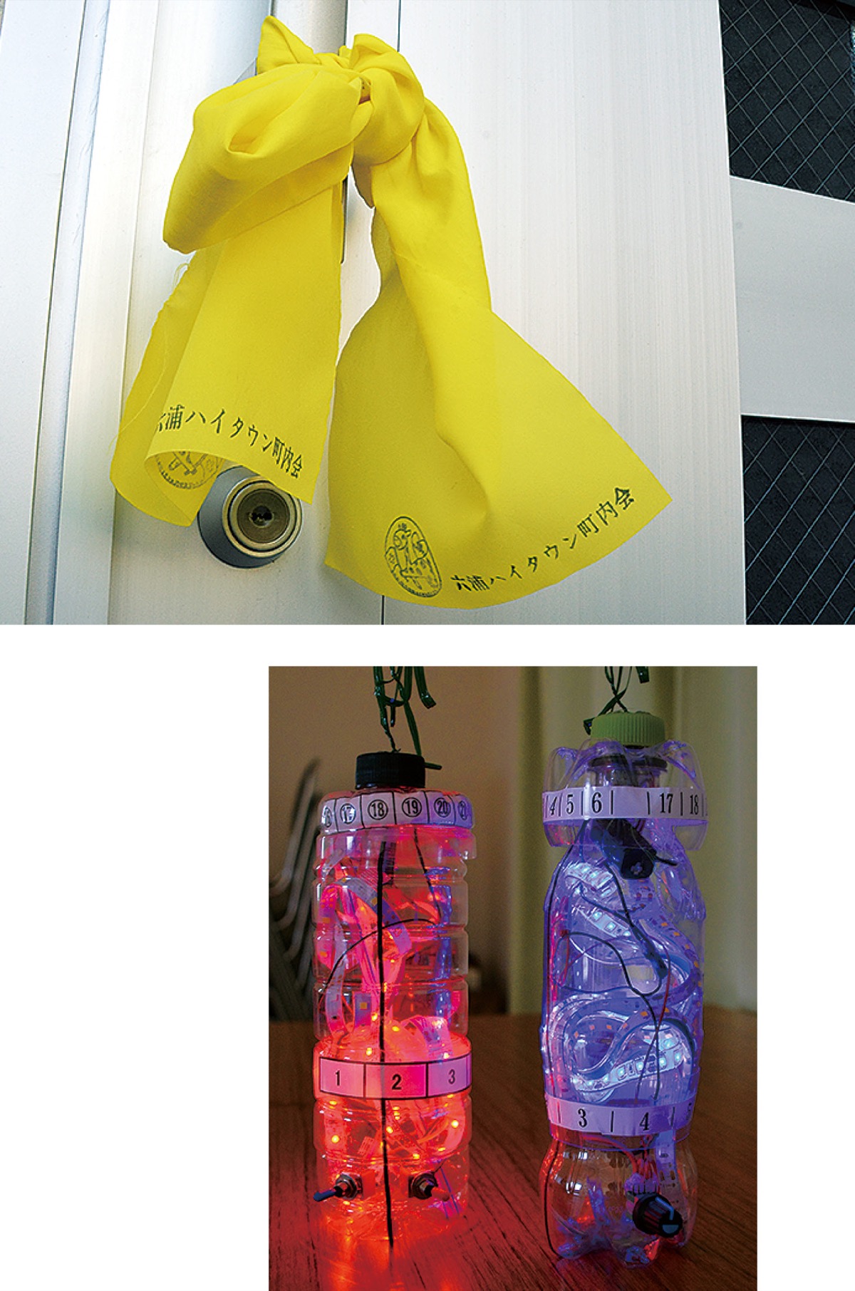 さらに、たすきでは判別が難しい夜間の安否確認を想定し、今年度は新たにライトの製作に取り組む。「助けが必要なら赤、無事なら青をつけ、何もついていない家は声をかける」と考案した同会の畑周明さん。ペットボトルやLEDなどの材料を組み合わせ、24時間問わず住民の安否を確認できる体制づくりを進めていく。