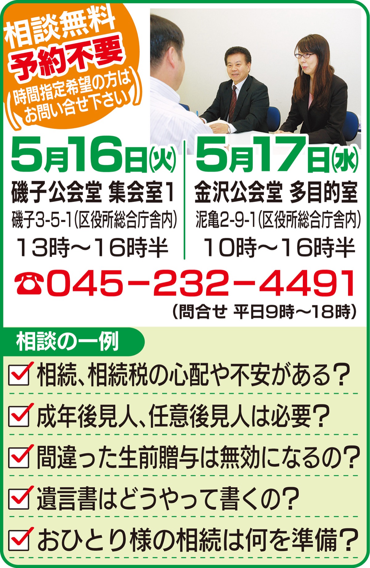 行政書士や司法書士などの士業をはじめ不動産コンサルタントなどの専門家チームによる相続全般に関わる無料個別相談会が開催される。横浜市民 相続 遺言 贈与相談センターの主催。